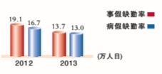 實施學生營養改善計劃也促進了學生主動到校學習,缺課率因此有所下降。2013年度,學生缺課率為26.7�萬人日,低於2012年度的35.9�萬人日。此外,與2012年度相比,無論是事假缺勤率(從19.1�萬人日到13.7�萬人日),還是病假缺勤率(從16.7�萬人日到13.0�萬人日)都比2012年度有所下降。(記者 晉浩天)制圖:袁昕