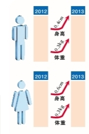 2013年度,6至15歲男、女生在各年齡段的平均身高比2012年度分別增加0.4cm和0.6cm,男、女生體重均增加了0.3kg。