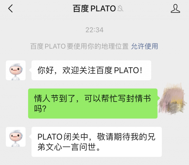 或许是因为回答的答案不尽如人意,PLATO已经停止服务。PLATO官方公众号称,“PLATO闭关中,敬请期待我的兄弟文心一言问世。”