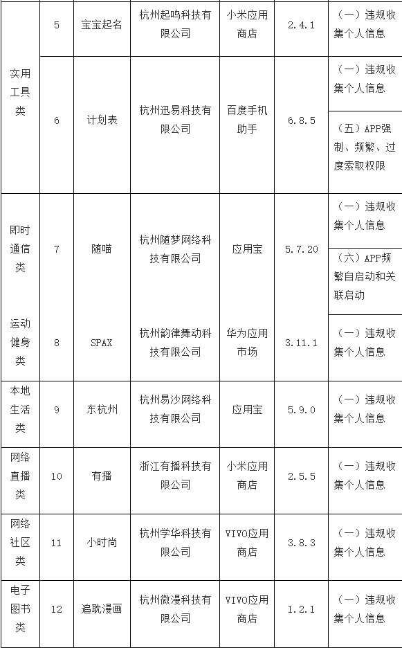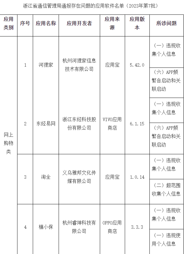 中国网科技9月13日讯(记者 叶小源)据浙江省通信管理局官网消息,近期,浙江省通信管理局组织第三方检测机构对群众关注的网上购物、实用工具、即时通信等类型APP进行检查,并书面要求违规APP开发运营者限期整改。截至目前,尚有12款APP未按要求完成整改,现予以通报。 浙江省通信管理局在通报中指出,请上述12款APP开发运营者在9月13日前完成整改落实工作,整改落实不到位的,将视情采取下架、关停、行政处罚等措施。 以下为浙江省通信管理局通报存在问题的应用软件名单(2023年第7批):