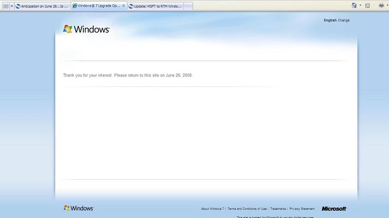 | Windows 7将在6月26日RTM,届时微软可能会公布升级价格等信息,为此微软将启动一个名叫windows7upgradeoption.com的网站来陪伴Win7完成发布进程。目前这个主页上仅有建设中的信息,由微软的多个部门共同维护,其中就有微软中国.