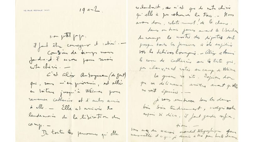 19 April 1945 letter from Christian Dior addressed to his father concerning his sister Catherine who had just been released from the concentration camp in Ravensbrück. A translated excerpt reads, "My dear father... We must be courageous and patient... Two or three days after the liberation of the camp, half of the deportees, almost all women, were sent to Czechoslovakia... I kiss you both very tenderly, and in spite of our crushed hopes we must remain optimistic. Tian" Adrien Dirand When a designer label moves from the personal vision of its founder to a brand, there is inevitably a change of tone. Crossing the nave from family to the ‘school of Dior’ replacements, the display is less convincing as museum-worthy – especially as it ends with a ‘ballroom’ display of dresses that includes both those worn to the mythic 1951 event organised at the pinnacle of society by Charles de Beistegui