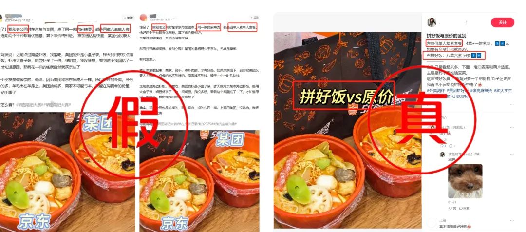 官方声明称,这类内容在语言风格、表达逻辑、造谣内容基本一致,甚至有多个账号套用同样的文案,如:甚至出现多个男性账号也用“我和老公”等字样,最终指向“美团外卖因抽佣高,导致在美团点餐,出现商家减量、降质”等。