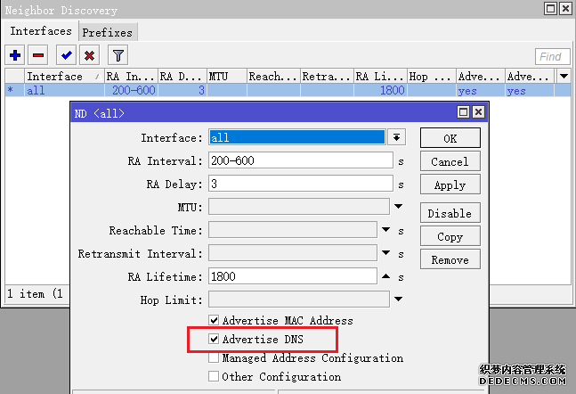 ND分配方式,确保IPv6->ND菜单下的Advertise DNS勾选,用于ND为主机的DNS分配