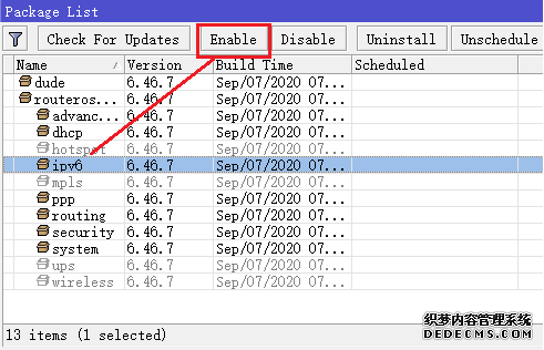 当前三大运营商已经在给家庭宽带分配IPv6地址,如何通过RouterOS路由器获取并分配给内网的主机使用,这里简单说明下 首先需要确认你的RouterOS已经安装并启用了IPv6功能包,MikroTik硬件的RouterOS系统都带有IPv6功能包,但默认情况下是disabled状态,需要在system package里选择enable启用,并重启路由器。