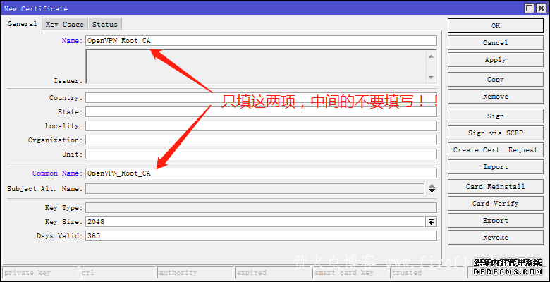按顺序填写 General 页面内容,然后切换到 Key Usage 页面,按如下勾选。