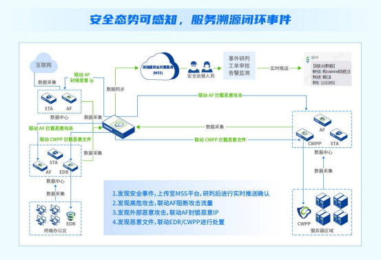 为了解决攻防对抗连续性和人员精力的问题,安全托管服务MSS应运而生。我们将EDR、SIP接入MSS,以7*24小时持续在线服务,提供专家级能力支撑。 基于过往安全建设的持续投入,深信服安全运营体系能力不断加强,至此能有效满足常态化安全运营场景的各类需求。