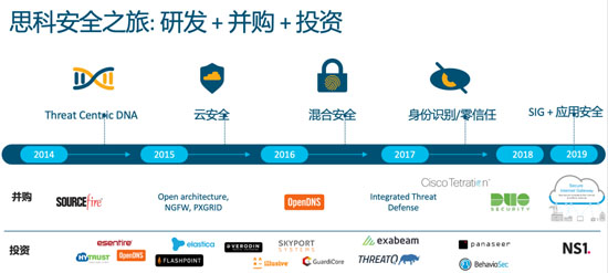 思科拥有将外部创新与自身的客户和合作伙伴的优势充分有机结合的能力,每一笔交易都帮助思科实现长期盈利增长和技术跨越。思科为近 30 年的并购经验和 25 年的风险投资感到自豪。 “ AI ” 驾驭什么 并购 - 我们收购的公司为思科带来伟大的人才和技术、成熟的产品或新的业务模式。 投资 - 直接投资和投资合作伙伴关系可帮助思科获得新技术和市场的经验。 成功案例 如何打造业界第一安全品牌 举一个例子,让大家更直观地感受到思科是如何四驱并行,一路引领成为网络安全巨头的。 思科是全球排名第一网络安全品牌,也是 Forrester Zero Trust Wave 报告中的领导品牌。这并非一朝一夕之功,也不可能一蹴而就。 下图就很好地诠释了思科成功之旅。苦练内功,加强研发,例如 Tetration ;并不断并购,例如业界最佳入侵检测 IPS 公司 SourceFire , 下一代云安全 OpenDNS , 基于 SaaS 的多因素身份认证系统 DUO 等。实际上,思科很早就完成了对很多公司的布局,前期投资了 OpenDNS ,DUO 等公司。此外,这些公司长期与思科有大量的技术与业务合作,因此到最后完成并购也是顺理成章,水到渠成。
