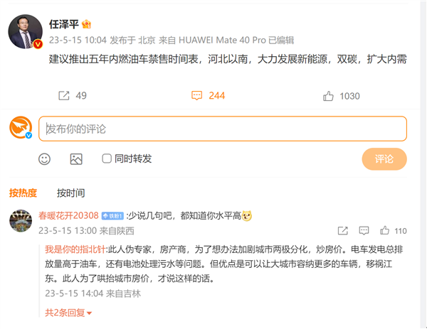 专家任泽平建议五年内禁售燃油车:曾批苹果捧华为 国人人傻钱多