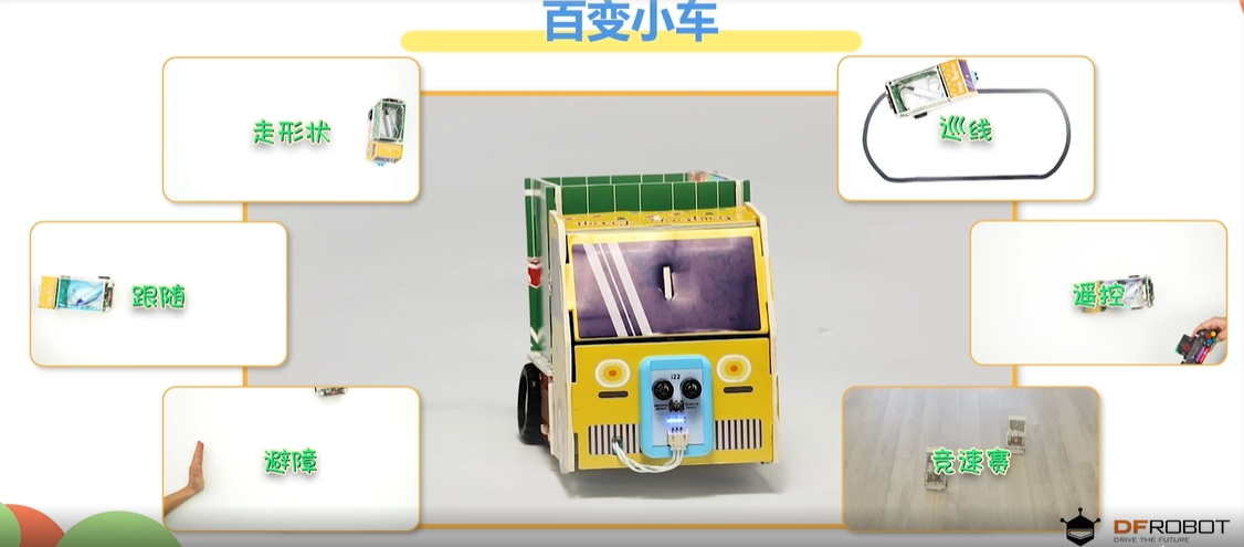 百变小车 比如,用造物粒子结合Mind+青少年编程软件制作的“炫酷吉他”项目,很受小朋友们的喜欢。这个项目中使用到造物粒子中的元器件,包括Micro:bit主板和扩展板,导电铜箔胶带,灯带。主板是整个系统的核心,负责控制各个模块的运行。Micro:bit可以通过Mind+编程来控制内置的音频,使“炫酷吉他”发出声音。通过导电铜箔胶带及利用人体具有导电的功能,“炫酷吉他”会随着不同的按键闪烁不同的颜色。这个项目不仅展示了小朋友的创造力和编程技能,也让我们看到了科技创新的无限可能。
