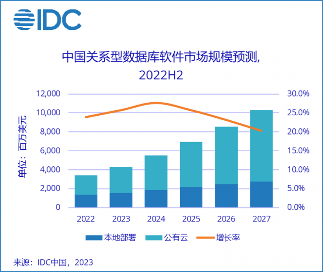 图说: 2022年中国公有云关系型数据库市场,阿里云绝对优势夺冠 根据IDC报告,2022年中国关系型数据库软件市场规模达到34.3亿美元,其中,公有云关系型数据库规模增长至20.8亿美元,在整体市场占比首次突破60%;预计到2027年,整体市场规模将达到102.7亿美元,未来5年市场年复合增长率为24.5%。 在中国关系型数据库市场,阿里云继续领跑,连续第3年稳居全年首位。2022年度,阿里云整体市场份额(公有云+本地部署模式)达到27.1%,份额持续提升,增速远高于市场平均水平;在增速最快的公有云部署市场上,阿里云以42%的份额连续4年蝉联第一,市场份额大于2到4名的总和,持续彰显领先优势。