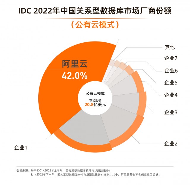 日前,全球领先的IT市场研究和咨询公司IDC发布《2022年下半年中国关系型数据库软件市场跟踪报告》,报告显示,2022全年阿里云市场份额(公有云+本地部署模式)位居第一,其中公有云模式市场份额高达42%,以绝对优势连续4年蝉联榜首。