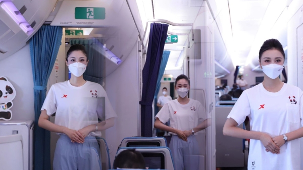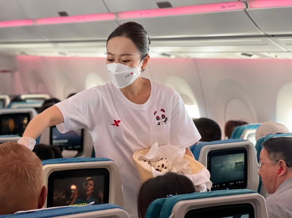 执飞此次航班的为川航A350“大运号”飞机,机舱内进行了大运会倒计时10天主题布置,特步为本次航班独家提供大运特许款装备,共同营造浓浓的大运氛围。航班上,乘务组精心准备了“大运主题特色饮品”及“蓉宝熊猫包主题点心”,并邀请旅客参与大运知识有奖竞猜活动,赢取川航“大运号”飞机模型、成都大运会吉祥物“蓉宝”公仔、特步小礼品等。主题航班活动既增加了公众对大运会的了解,也丰富了乘机体验。