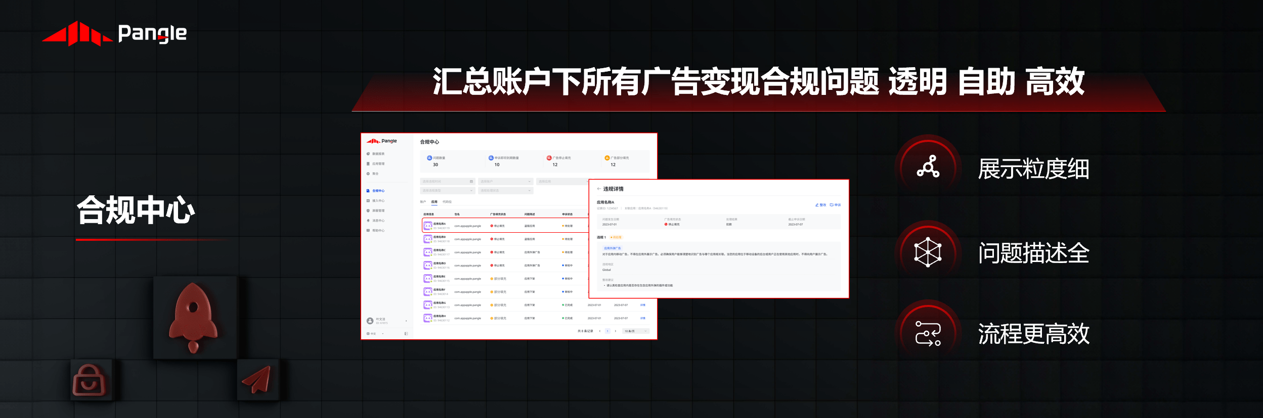 Pangle合规中心:Pangle将于今年第三季度末发布“合规中心”,通过在Pangle开发者平台内设置入口,汇总并分类开发者账号下所有广告变现合规问题。同时,合规中心将针对每个问题从具体违规原因及整改建议进行详细说明,以方便开发者查询和自助分项跟进。