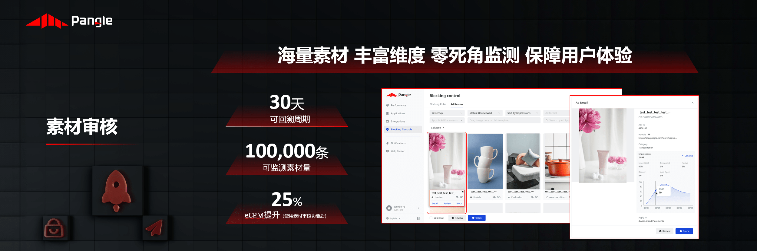 在流量质量方面,Pangle通过严格的广告政策与规范的广告标准,禁止虚假流量、违规流量等不良广告行为。在流量接入各环节中,Pangle不仅会对入驻开发者的公司资质及应用资质的有效性进行检验,还引入了国际知名全渠道流量监测和反欺诈公司Pixalate等第三方机构观测风险流量水位,提升流量安全的策略水平。 在变现安全方面,Pangle通过强大的素材审核体系及对高危行业的限制准入,持续提升平台广告质量,保证用户在App内的广告体验。同时,通过实时收取用户对素材的反馈,及时暂停高危内容投放,并根据定期分析风险素材特点,有效反哺投前审核策略,提高素材安全水位。此外,Pangle还会根据各流量地区的特殊法律法规,相应调整不同广告行业或素材在该地区投放的准入条件,确保广告投放合规。 为更好地保障开发者变现安全,Pangle推出了「素材审核」和「Pangle合规中心」两大产品。 素材审核:通过素材审核,开发者可对近30天内最多10万条应用内广告的海量素材进行监测,也可让投放素材更加透明化,让开发者更放心放开更多预算类型,从而获得收益提升。