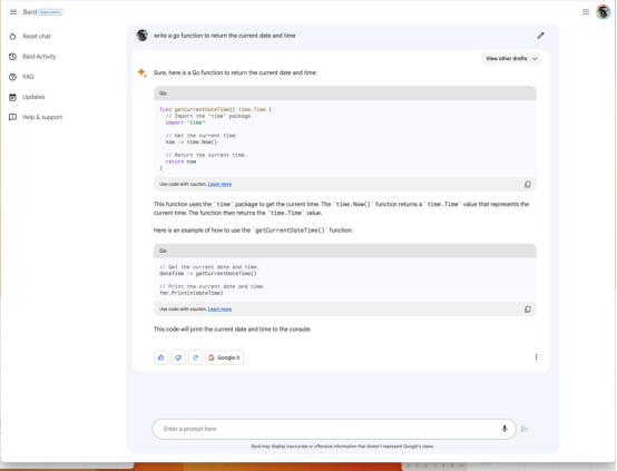 图3 Heller使用Amazon CodeWhisperer生成代码。在文件的顶部输入了注释,剩下的大部分都是CodeWhisperer。Heller必须从几个选项中选择代码,并从前一个选项中删除未使用的导入语句 Bard Bard于2023年4月21日宣布支持编程。该公告指出,支持20多种编程语言,包括C++、Go、Java、JavaScript、TypeScript和Python。作为一个快速测试,Heller让Bard“编写一个Go函数来返回当前的日期和时间。”它做得很快: