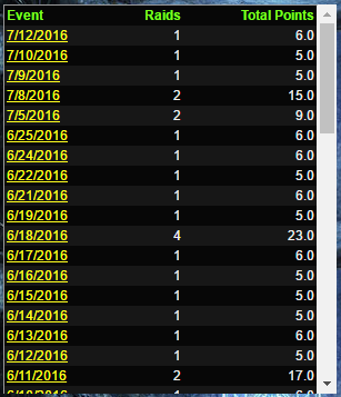 D1:所有帮派活动总统计以及DKP积分发放(按日期) D1.1:帮派活动日期(Event) D1.2:当日帮派活动次数(Raids) D1.3:人均积分发放(Total Points)