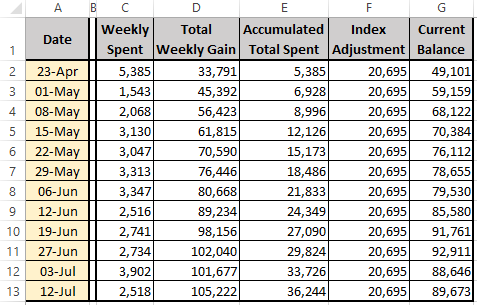 D4:单DKP拍卖物品及成交量数据 4。天下第一DKP数据的管理及应用 天下第一的DKP在九阴的时候是最保值的,别人调侃说天下第一的DKP是美金。 想做到这点,就应该严格对待DKP的价值,不能滥发增发,也不能让物品的价格太高或者太低,一切应该有一个合理的增长。如果你把DKP当作一种货币来对待,去管理它,那么DKP才能一直坚挺。 4.1。 帮派DKP增长数据 帮派DKP增长数据很重要,增长过快,有问题,需要通过调整DKP产出减缓,或者DKP拍卖的时候增加DKP拍卖物品来减速,增长过慢,也不好,需要缩进DKP拍卖来刺激,当然,需要刺激宏观调控的准确需要最能落地的算法。 说到能落地的算法,首先要讲一下Index。(Nominal Index) Index这里是指一个基数的概念,也就是说,你统计每一天的增长,不可能按照第一天原始值是0来算,那么原始值多少为合适呢? 这里说说天下第一的DKP是怎么从零到现在搭建起来的吧。 天下第一最早取得值,是用历史帮贡为基础。 公式:A的基础DKP = A历史帮贡 x 5% 然后这样一来,初期天下第一按照帮贡发放的初始DKP有20,695,接着,我们再用4.22大拍卖来刺激消费,4.22大拍卖当天总消费5,385点DKP,然后我们在DKP开放的前一个月,已经开始计分,DKP计分规则采用了双倍,三倍积分的方式,大量发放DKP,这样,除了老人福利,让新人也稳定的拥有了很多DKP,大家在这前一个月自然获得了33,791点DKP。 DKP初始余额:33,791 + 20,695 – 5,385 = 49,101 也就是说,初始值的DKP基础值,减去第一周的消费最后余额剩下了49,101点DKP。 下面要说说增长数据,我们最关心的3个数字: 1。 DKP累计周获得:Total Weekly Gain (TWG) 2。 DKP累计消费:Accumulated Total Spent (ATS) 3。 DKP余额:Current Balance (CB) 计算公式: CB = TWG + IA – ATS (IA=Index Adjustment) 套用公式获得以下数据。