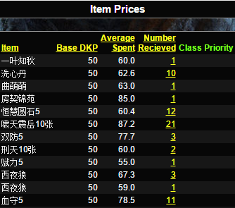 D3.1:DKP拍卖物品科目(Item) D3.2:DKP拍卖物品单件均成交价(Average Spent) D3.3:DKP拍卖物品总卖出数量(Number Received) 注:Base DKP只是系统生成的Index值。