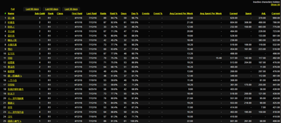 3。天下第一DKP系统数据采集 数据采集是天下第一DKP系统非常重要的一个环节,通过数据采集,除了帮助统计DKP分数以外,还能通过数据的分析及应用知道帮派成员的活跃度,帮派活动的参与度,以及DKP是否贬值,物品价格是否合理等等。 下面有很多类项目,需要收集:(为了帮助大家一目了然,添加了英文备注) A类:公开信息收集 A1。游戏ID(Name) A 2。帮派[1帮/2帮/3帮/4帮](Sub-Guild) A 3.DKP等级[R1/R2/R3/R4](Rank) A 4。职业(Class) A 5。第一次参加帮派活动时间(First Raid) A6。最后一次参加帮派活动时间(First Raid) A7。总帮派活动参与次数(Raids) A8。总帮派活动参与次数百分比(Raid %) A9。总帮派活动参与天数(Days) A10。总帮派活动参与天数百分比(Days %) A11。周平均DKP获得(Avg Earned Per Week) A12。周平均DKP消费(Avg Spent Per Week) A13。总DKP获得(Earned) A14。总DKP消费(Spent) A15。人工调整(Adj。) A16.DKP余额(Current) A类数据采集参考传送么门: