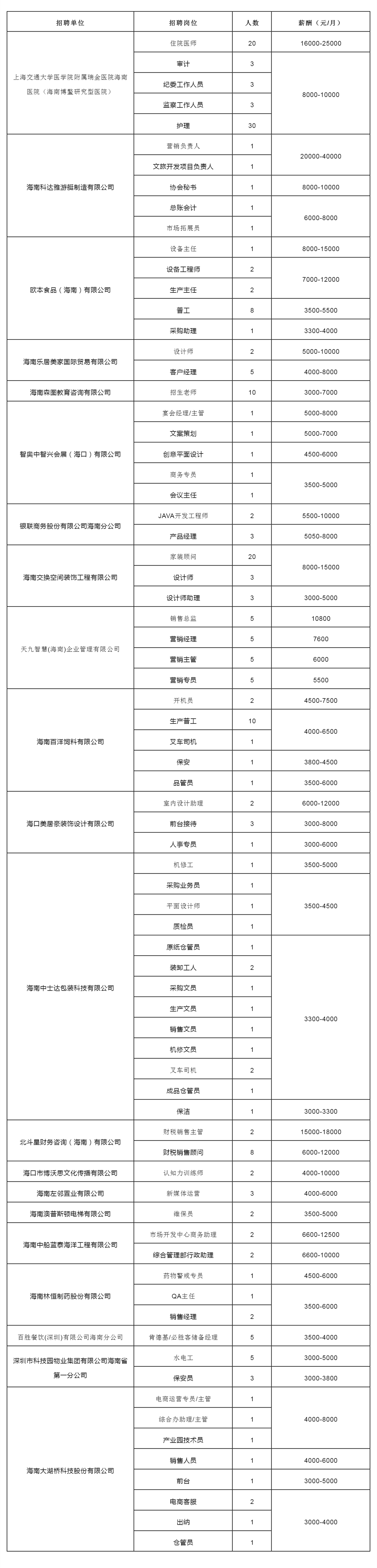 6月27日,2023年海南省百日千万招聘专项行动公共招聘会将在海口举办。截至6月26日17时,承办方已征集51家用人单位,累计提供岗位878个。 据了解,参加此次招聘会的部分用人单位开出较高薪酬。其中,上海交通大学医学院附属瑞金医院海南医院(海南博鳌研究型医院)住院医师月薪为1.6万元至2.5万元。海南科达雅游艇制造有限公司营销负责人、文旅开发项目负责人月薪均为2万元至4万元,协会秘书月薪为8000元至1万元。欧本食品(海南)有限公司设备主任月薪为8000元至1.5万元,设备工程师、生产主任月薪均为7000元至1.2万元。银联商务股份有限公司海南分公司的JAVA开发工程师月薪为5500元至1万元。海南交换空间装饰工程有限公司家装顾问、设计师月薪均为8000元至1.5万元。北斗星财务咨询(海南)有限公司财税销售主管月薪为1.5万元至1.8万元。海南中船蓝泰海洋工程有限公司市场开发中心商务助理月薪为6600元至1.25万元。 将于6月27日9时至12时举办的此次招聘会,地址位于海口市美兰区和邦路3号的海南省人力资源开发局(省就业局)一楼公共招聘大厅。 附件:部分岗位预览