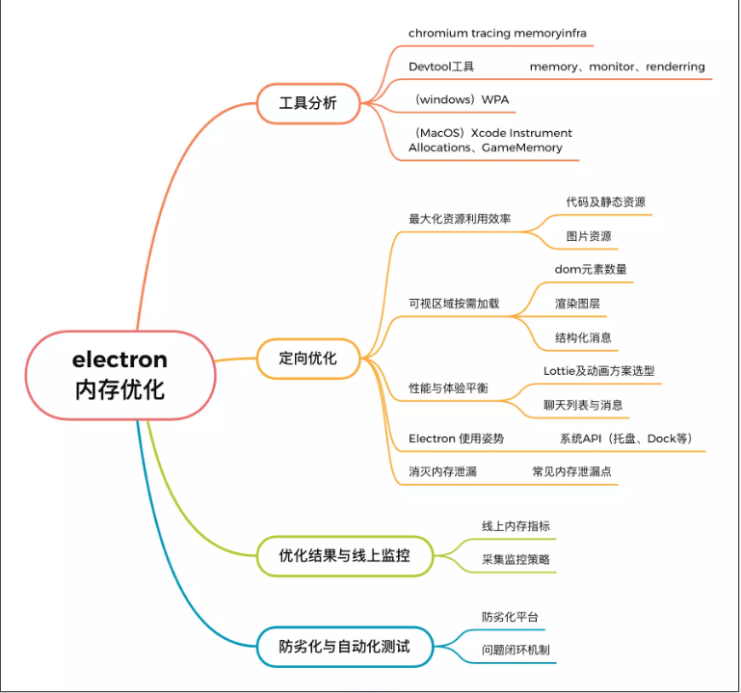 “我们觉得不需要单纯因为口碑问题,就对这个选型没有了期待。还是要从实际出发,哪种技术栈适合你的产品,看看到底能不能有技术实力去把这个事情搞定。” 内存优化:如何有效控制 Electron的内存占用? 外界之所以会觉得 Electron内存占用高,是因为其本身是一个多进程的架构,主进程基于 Node.js,而每个窗口都对应一个渲染进程以及 V8实例。可以说从技术框架层面上,上手写代码很容易,但不容易去管控它的内存。 QQ技术团队认为 Electron的开发者更多的是前端的开发者,可能在思维上没有去考虑怎么在这样一套技术框架里,去对内存数据进行管理和管控。开发者需要从前端开发者的思维,转变为客户端开发者的思维。 综合来看,对内存的看法其实不完全是 Electron的技术框架所导致的,更多的是门槛上、开发思维上,导致内存没有得到很好的关注和优化。其实最简单的 Electron应用大概也就只有几十兆的内存占用。因为前端原本更多还是停留在开发即用即走的 Web站点,很少实现一个超大客户端,缺乏控制内存的经验,所以面对 QQ这么大一个产品的时候,你就必须非常在意内存的使用和管控。 至于优化内存的突破口,可以说是从各个层面:从消息的链路中的每条消息的收发上,数据是怎么管理,包括像窗口及会话的管理,都得精打细算,也会做一些数据本地化和一些机制的按需加载,包括渲染上他们也提出一个根本的原则:“要做到所见才占用”,既我们看到的内容才占用这一部分内存,没看到和用不到的任何场景的内存就不应该再占用,通过各种方式来去让内存达到一个设定的目标。 他们也使用了不同维度的内存分析工具,从 V8引擎到进程,再到整个应用程序,打通整个链路进行多角度的细节分析,以此来定位内存使用的瓶颈。之后采取一系列的针对性优化策略,包括缓存策略、按需加载、优雅降级等,同时使用线上监控、自动化测试手段,包括借助开发框架、工具建设、代码审查等,来阻止性能退化。(更多细节可以参看技术文章:新 QQ NT桌面版如何实现内存优化探索?)
