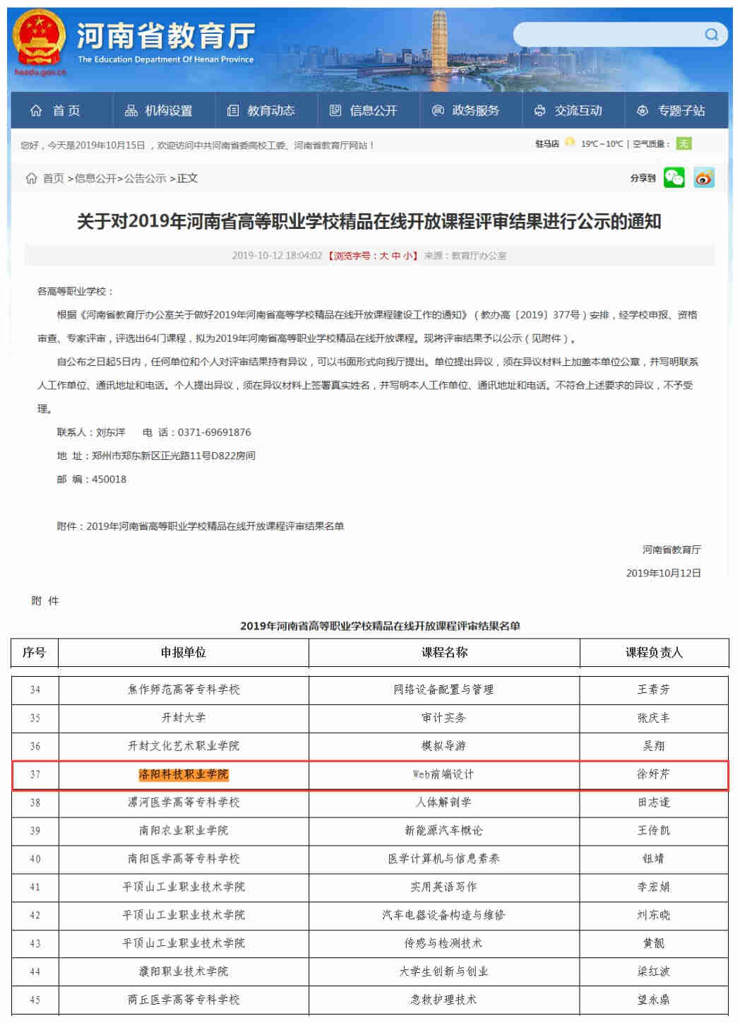洛阳科技职业学院《Web 前端设计》课程获批2019年省高校精品在线开放课程立项