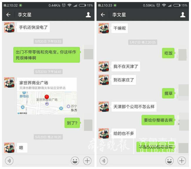 5月20日上午11时许,李文星给妹妹李文月发来位置定位,称自己已经抵达天津滨海区。此时,李文月就在距离滨海60公里外的天津华苑产业园区内,因为要忙于工作,兄妹两人约定,待李文月休班时就去看他。 李文月回忆,哥哥的“异常”是从5月20日下午开始的。亲属及朋友一致怀疑:李文星或许就是5月20日下午至晚上被控制起来的。 5月20日晚上9、10点左右,李文月曾跟哥哥通过电话,李文星仍称自己在滨海。但当日下午2时41分,李文星发给同学陈立(化名)的位置则显示,当时他已抵达天津静海区。在看到李文星发送的位置后,陈立曾询问:“到了?”李文星却突然没了回复,一直到晚上6时20分,李文星才给他回了一句“嗯”。此后,陈立多次发消息询问情况,但一直到5月21日上午12时41分,李文星才回复称:“昨天来晚了就在宾馆住下,现在刚吃了饭,一会去公司看看。”