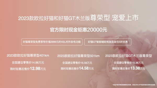为了更好地回馈用户,欧拉品牌针对好猫和好猫GT尊荣型,推出了2万元现金优惠,以及免费安装充电桩等多重福利!2023款欧拉好猫401km尊荣型,全国建议零售价14.98万元,限时钜惠后售价12.98万元;2023款欧拉好猫501km尊荣型,全国建议零售价16.58万元,限时钜惠后售价14.58万元;2023款欧拉好猫GT木兰版401km尊荣型,全国建议零售价15.38万元,限时钜惠后售价13.38万元。同时,好猫尊荣型的下订用户,可免费享有价值2999元的V2L对外放电功能;已经标配了V2L功能的好猫GT尊荣型,也可以用5折价格选装智能辅助驾驶选装包!