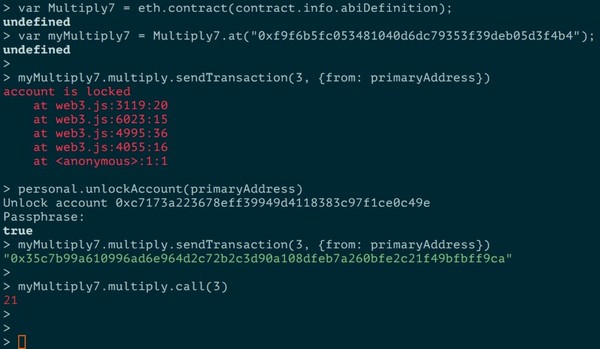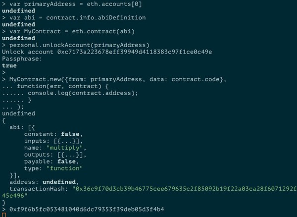 确保有解锁的账户和资金,部署完成后,在区块链上就会创建一个合约。这一步骤是需要支付执行的。一旦transaction成功进入区块,账户余额会根据以太坊虚拟机的gas规则被扣减。