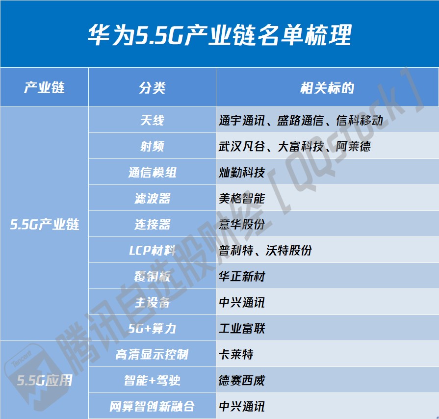 早间重磅新闻速览 1、华为5.5G再迎新突破!产业链核心标的一览 近日,华为率先完成5G-A全部功能测试用例。华为孟晚舟此前表示,全球5G商用四年来持续引领价值创造,5.5G是未来发展的必然之路。 产业链上,天线、滤波器、PCB等环节有望受益。应用场景方面,5.5G将为沉浸式互联网、通感一体、智能驾驶、云应用等一系列新技术带来商机。