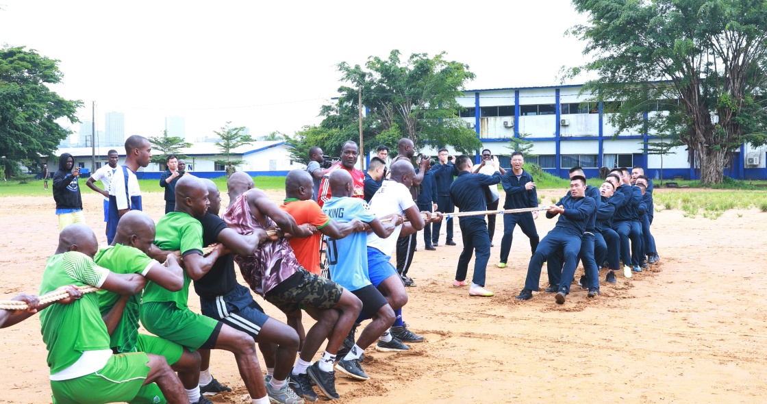Members of the 43rd Chinese naval escort taskforce host a friendly tug-of-war game with the Ivorian sailors at an Ivorian naval base on June 24, 2023. (Photo by Wu Kangci/Xinhua) 6月24日,中国海军第43批护航编队官兵与科特迪瓦海军官兵在科海军基地进行拔河友谊赛。新华社发(吴亢慈摄)