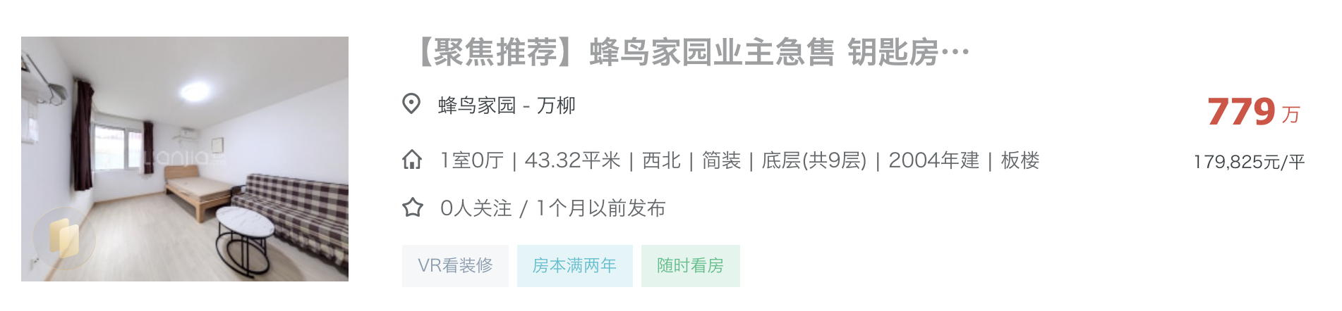 来源:链家网 在链家网上,目前蜂鸟家园在售的71套房源中,均价约16.3万元/平方米;最贵的单价为17.98万元/平方米,面积为43.32平方米,总价779万元。不过记者也注意到,目前尚未看到单价超过18万元/平方米的二手房源。