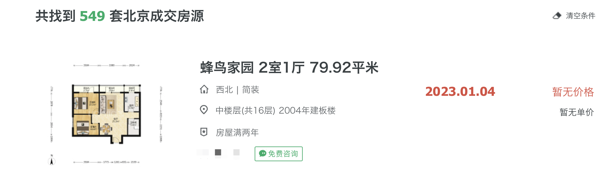 来源:链家网 而在2021年3月,学区房涨势正猛,蜂鸟家园在链家可查的仅3套房源,最小一套50.87平方米的报价915万元,单价约18万元/平方米。 客观来看,在2021年9月海淀29个小区二手房参考价发布以及有关部门多重管理之下,北京学区房明显降温。 一个典型的案例便是,2021年12月,有蜂鸟家园经纪人曾向每经记者透露,有一套挂牌很久的40多平方米房源,2021年初报价1100多万元,现在800万元左右就可以拿下。 根据诸葛找房数据,从当前来看,今年以来北京二手房市场面临着一定的下行压力,2023年1-8月,北京二手住宅成交105010套,较2022年同期上涨9.8%,但较2021年同期仍下降13.5%。同时,今年4-7月北京二手房连续4月呈现下滑态势,8月在政策利好拉动下止跌回升。
