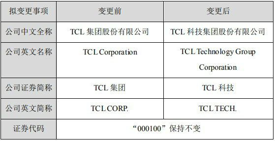 “TCL集团”变更为“TCL科技” 英文简称变更为“