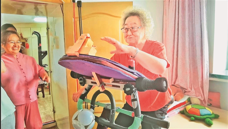 一位老人在器械上健身。