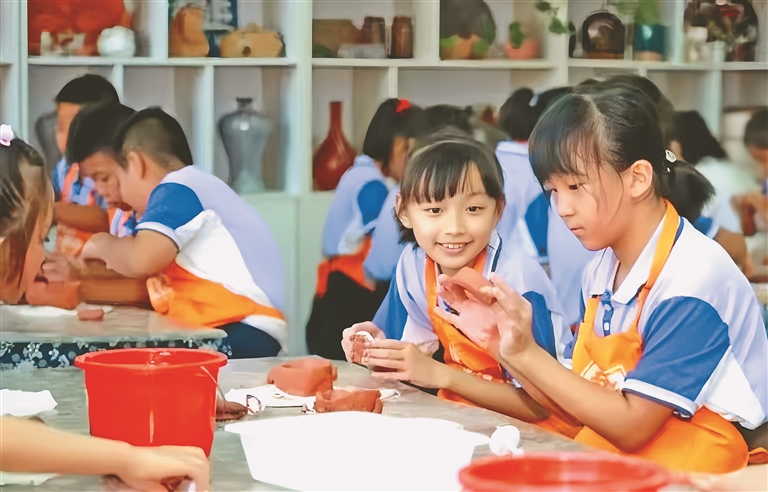 孩子们在开心地制作陶泥手工。