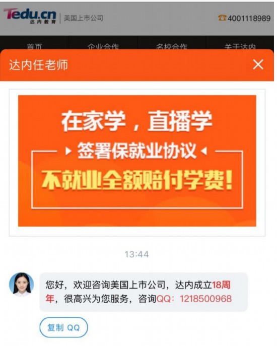 中新經緯客戶端9月2日電 (羅琨 實習生唐曉宇)“高薪、包就業”“隻要四個月,包你換一個好工作”……近年來,互聯網行業的高薪吸引著大量求職者的目光,一些速成培訓機構由此應運而生,聲稱隻需要極短的時間就可以幫助求職者掌握編程等技能,從此轉行獲得一份高薪工作。如果求職者無力支付高昂的培訓費,他們會幫忙貸款。這樣的一條龍服務究竟暗藏著什麼? 查額度時“被貸款”? 河北的王輝是醫院的護士,去年報名了達內教育的Java編程培訓課,准備換一份工作。 達內全稱為達內時代科技集團,是一家美股上市公司,也是國內IT培訓的龍頭企業。公開資料顯示,達內教育集團創始人自2002年3月創辦達內,並將其發展為IT、泛IT、非IT職業教育及少兒編程教育為核心的綜合教育集團,於2014年4月在美國納斯達克上市。其總部設立於北京,在中國70座城市內建立了330余家培訓中心,員工過萬。據其官網顯示,達內與全國1000余所高校開展校企合作,於2002年至2020年間幫助100萬學員成功就業。 看上去應該是一個靠譜的機構,抱著這種想法,王輝們走入了達內教育的大門。 當得知學費需要22800元時,王輝開始決定放棄報名。據其回憶,該機構的工作人員讓王輝下載了一個互聯網金融APP,看看是否有資格貸款。“他當時拿著我手機和身份証出去了一趟,再后來我就發現我的手機裡有一筆欠2萬多的貸款,分了20期,而且利息非常高。”王輝回憶稱,對於這筆突然多出來的貸款,機構人員表示培訓之后再工作兩個月很快就會還清貸款的。在工作人員不斷勸說下,王輝最終簽了合同。 與王輝的經歷類似,來自山東的呂暢在進行“查詢貸款額度”的操作后,背負了本金21800元,利息6215.64元,分24期還清的貸款。“他們問我有沒有貸款額度,給了我一個二維碼,讓我掃一下試試,我那時隻想看看自己的額度,結果直接就付款了,收據、發票都沒有,就讓我下個月開始還貸。”呂暢說。 另一名學員何蕊則被招生老師告知,他們的貸款屬於政府貸款,貸款對象隻能是學生或者年紀較小的求職者,並表示每月貸款利息特別低,這一“承諾”打消了何蕊的顧慮。 2萬元買來一堆視頻課 達內教育北京官網信息顯示,Java課程1908班學員平均就業薪資達12650元/月。產品經理、軟件測試等培訓班學員平均薪資也在1萬元左右。 如果貸款買來的課確實有含金量,相比未來的職業前景,2萬元的前期投資也並非不能接受。 不過,多名學員反映,在貸款后,他們才知道,上課的形式並非面授而是網課模式,之前所說的一對一教學改成了錄播課。 失望之下,這些學員決定找達內退款。何蕊告訴記者,她在離開后的半小時內便返回學校要求退款。雙方協商后決定於8月17日退款,但截至發稿這筆貸款仍未取消。 此外,相比交錢以前百般熱情地推銷,交錢以后就無人再跟進學員的學習進度,據呂暢回憶,階段性考試也沒有人通知考試形式、內容,“仿佛交錢以后就跟他們沒關系了。” 在交款之前,達內的官網承諾保就業,不就業就全額賠付學費。“我當時截了官網的截圖。今天去他們官網,已經不那麼說了。”王輝說,“現在課上完了,我沒有找到新工作,學的東西也沒什麼幫助,之前的工作也耽誤了,還要還貸款……”