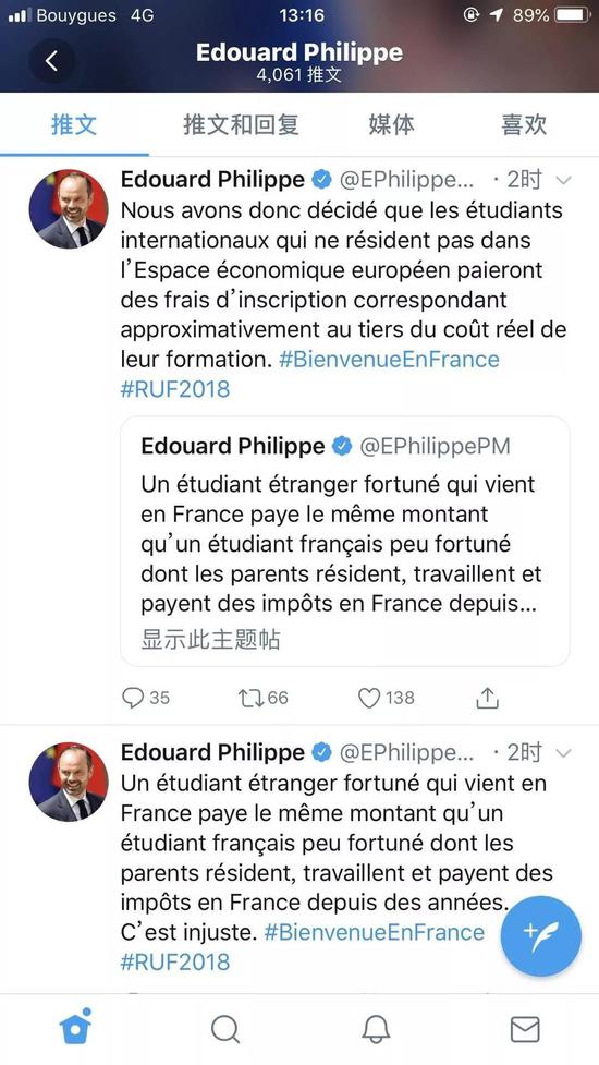 按照总理先生自己的话说,“一个来到法国的家境富裕的(也有人翻译成“幸运的”,法语中fortuné确实有这两层意思)学生,和父母居住、工作在法国,并且在法国交税的法国学生付一样的注册费。这是不公平的。”