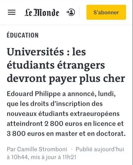 原标题:法国总理宣布公立大学对非欧盟学生大幅涨价,对法国留学的未来有何影响? 昨天注定是一个不寻常的周一,从傍晚开始,汤叔的朋友圈和各种咨询群里就开始炸锅了,原因很简单,就是因为法国总理 Edouard Philippe的一番表态。 法国总理周一(即昨天)在Rencontres universitaires de la francophonie上宣布:对于未来想要就读法国公立大学的非欧盟籍外国学生来说,大学注册费将上涨:本科阶段由原来的170欧,变为2770欧;硕士和博士阶段将分别由原来的243欧和380欧上涨为3770欧。上调后的注册费将达到实际教育费用的三分之一左右。