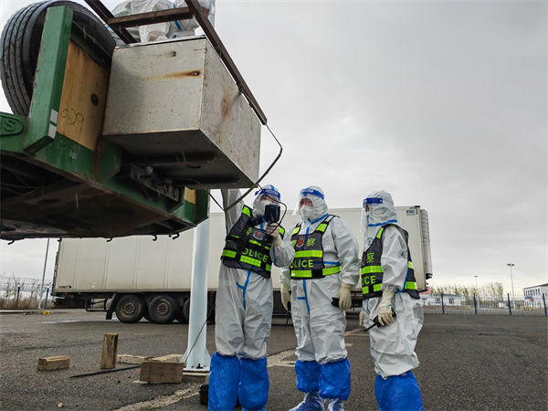 為了提高口岸限定區域管控效能,黨員突擊隊配備了巡邏車輛,因為口岸限定區域較大,近6.2萬平方米區域內,巴音查汗副站長帶領巡邏民警能夠快速高效到達各個崗位,提升了區域內見警率。 限定區域內可能會遇到各種問題,包括出入境車輛擁堵、外語翻譯。因此,在警力配置上,黨員突擊隊充分發揮了民警們的特長。 執勤隊副隊長阿爾那是哈薩克族,結合他的特長和出入境邊防檢查實際,黨員突擊隊決定讓他在國門引導崗位,負責對出入境車輛進行引導。同時,也就成了突擊隊民警的“哈語教官”,平時教大家一些常用哈薩克語,方便在工作中與哈薩克駕駛員溝通交流。 民警楊文生是單位的衛生員,在勤務間隙教其他民警必要的急救知識,來應對在限定區域內突發身體狀況。 “除了出入境邊防檢查,我們同時要密切關注疫情防控工作,穿著防護服在限定區域內得走近兩萬步。氣溫很低,戴著醫用防護橡膠的手都凍的麻木了。”穿梭在甩挂場地車叢中的執勤隊孫辰副隊長感慨地説,“截至今日,邊檢站查驗出入境交通運輸工具8千余車輛、貿易額達22.48億元,為國家經濟社會發展貢獻了邊檢力量。我們國門下的移民管理民警,可以説是中國警察的形象展示者。今天,我們雖然不能與家人團圓,但在崗位上給祖國慶賀生日,也是另一種幸福。”(通訊員:徐小惠 )