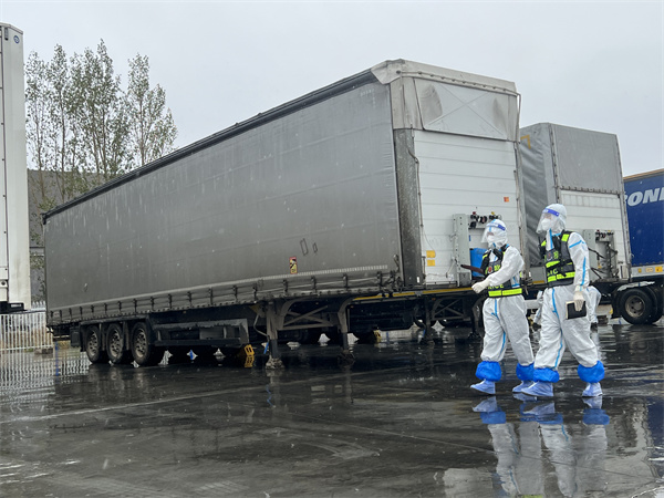 吉木乃邊檢站實施預約通關模式,限定區域內秩序井然。黨員突擊隊民警全員在崗,民警不到7點就早早起床,在各自宿舍核酸檢查、洗漱、就餐、整理好內務。9點30分整,黨員突擊隊通過對講機召開上勤會,部署當前勤務安排。10點整,民警換好防護服、戴上口罩、面罩、鞋套,守衛在口岸限定區域各個重點部位,開始了一天的警務工作。 剛上勤,就迎來秋季最大的一次降溫降雪大風天氣,氣溫直降到零下2攝氏度,風雪交加。但這絲毫阻擋不了出入境貨車的腳步。“注意安全!要等甩挂車輛停穩後,再操作卸挂車!”甩挂貨場引導崗位民警李書健快走幾步,一邊示意車輛停靠到指定位置,一邊指導甩挂場地工人打開工具箱檢查。 正在給入境貨車車體檢查的女民警嚴寒露,是首次到口岸限定區域工作。她與女民警邰瑛主動請纓,多次遞交請戰書。最終,兩人有幸成為疫情後首批進駐限定區域工作的女民警。工作中,兩人充分發揮女警柔性執法、服務群眾耐心細緻的優勢,成為口岸限定區域一道獨特的風景線。