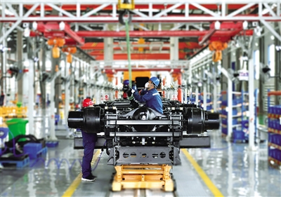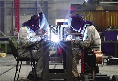 內蒙古北方重型汽車股份有限公司礦用車生產車間,工人正在進行零部件焊接。記者 孟和朝魯 攝