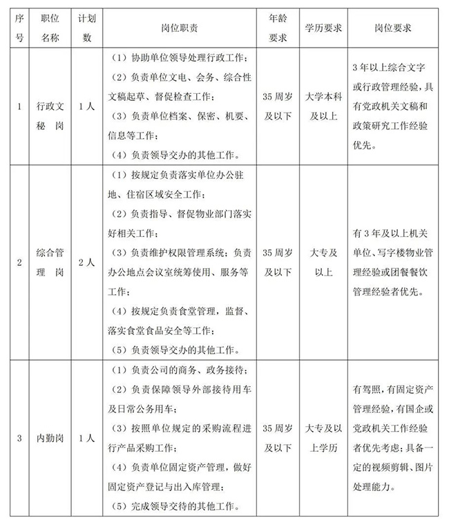雄安雄勤機關服務中心3個崗位招人 即日起報名 2022年04月27日21:08 來源:人民雄安網 人民網雄安4月27日電 (王紅)河北雄安新區雄勤機關服務中心發布公告,招聘1名行政文秘,2名綜合管理人員,1名內勤人員。 此次招聘實行聘用制管理,根據崗位設置和人員情況採取勞務派遣方式,與雄安人力資源服務有限公司簽訂聘用合同,派遣到雄安新區雄勤機關服務中心工作,合同期限為2年,試用期為2個月。 有意者可於5月11日前通過國聘雄才網(網址:https://www.ixahr.com/index.php?m=&c=jobs&a=com_show&id=28789)報名,或將應聘報名表發送郵箱XQZX0805@163.com進行報名。咨詢電話為0312-5620516。 詳情如下: 河北雄安新區雄勤機關服務中心工作人員招聘公告 河北雄安新區雄勤機關服務中心(以下簡稱雄勤中心),是全國首家以民辦非企業形式參與機關事務服務保障的單位。以建設一流的服務保障單位、打造一流的服務標准體系為發展目標, 著力打造新區“服務精准、專業精湛、管理精細、值得信賴”的金字品牌。現根據工作需要,面向社會公開招聘工作人員,工作地點在雄安新區。有關事項公告如下: 一、招聘原則 堅持德才兼備、以德為先的選人用人標准,貫徹民主、公開、競爭、擇優的原則,採用“按需設崗、競爭上崗、以崗定薪”的崗位聘用方式,實行“績效考評、能進能出、動態優化”的開放靈活用人機制,著重培養工作人員的專業素養和能力水平。 二、基本條件 1.具有中華人民共和國國籍﹔ 2.認真貫徹執行黨的理論、路線方針政策和黨中央關於雄安新區規劃建設的決策部署,樹立“四個意識”,堅定“四個自信”,擁護“兩個確立”,做到“兩個維護”,遵紀守法,克己奉公﹔ 3.熟悉國家相關法律法規及政策,具有履行崗位職責的綜合素質、專業知識、從業經歷、工作能力以及必要的任職資格等﹔ 4.遵紀守法,誠實守信,有良好的履職記錄,不在黨紀、政紀處分影響期間﹔ 5.具有良好的職業素養,勤勉盡責、開拓創新、團結合作、激情奉獻﹔ 6.具有良好的心理素質和能夠正常履職的身體素質。 三、招聘崗位及要求