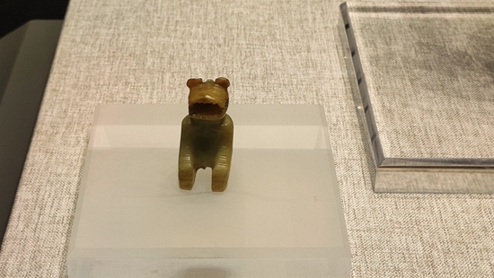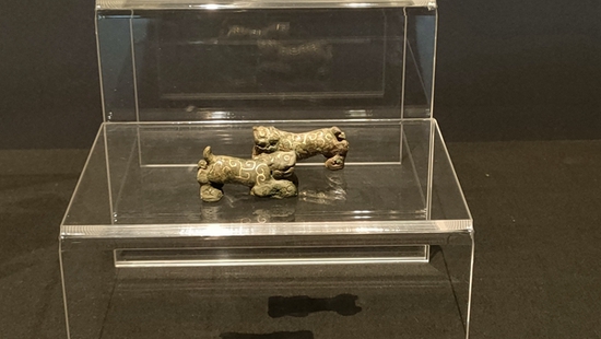 资料显示,玉虎形跽坐人像为西周时期文物,高5厘米,宽2.5厘米,厚2.8厘米。1997年出土于周口鹿邑县太清宫镇长子口墓,它体型很小,能惟妙惟肖地表现出虎首、人身、立鸮三种形象本已难得,加之三种形象完美地结合在一起,使整体造型流畅协调,丝毫没有突兀感就更属罕见。 市民赵先生则站在文物展柜前,拿起手机对焦拍摄。“这个是鎏金错银卧虎形铜镇,西汉时期文物,样子像一只猛虎,有驱魔辟邪的意思。”