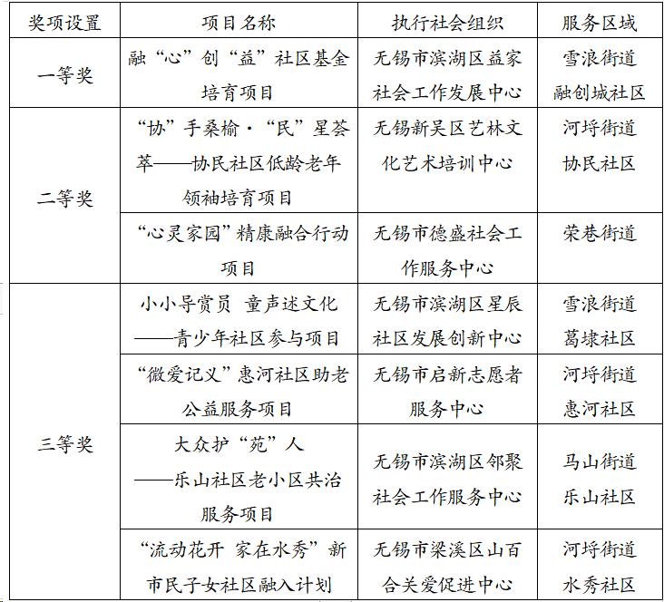 按照《2023年无锡市滨湖区社会组织参与公益服务项目创投活动实施方案》要求及《首届“2023无锡滨湖”社会组织公益创新项目大赛方案》奖项设置,经公开评选,获奖结果如下:
