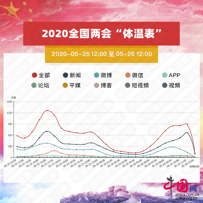 特别说明: 1、数据包括网络站点(PC)、微博、微信、App、论坛、平媒、博客、视频、短视频。 2、其中,“新闻”是指各类网站站点、新闻客户端。 3、其中,“平媒”是指电子报刊、杂志,但不包括各家报纸旗下的网站。 数据五:两会“体温表” 以当日时间进度为横轴,数据量为纵轴,对5月25日12:00至5月26日12:00所有关于“全国两会”的信息数据的流量进行分析统计,计算出当日全国两会“温度表”。 数据显示5月25日12:00至5月26日12:00期间“最高温”出现在5月25日14:00,数据流量达到峰值,有126009条数据信息同期传播。