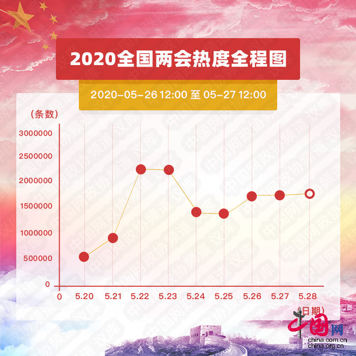 【今日大数据亮点】5月26日12:00至5月27日12:00期间产生涉及2020年全国两会信息168.9万条,与昨日同期数据相比有所增长。数据分析统计,“健康”“新冠肺炎疫情”“一国两制”“就业”等话题关键词更加受网友关注,占据全网两会数据信息的热门,全国政协委员提出“高铁票改签允许两次”等建言广受网友的热议。 中国网北京5月27日讯(记者 和海佳 宋柏霖)2020年全国两会期间,中国网(议库平台)联合智慧星光每日发布《2020全国两会大数据》。 上述大数据基于网媒站点、微博账号、微信公号、论坛(贴吧)、APP等信息大数据进行筛选采集,设置不同维度,开发数据模型,围绕两会热点,发布图文分析报告,供代表委员和广大网友参阅。今日数据采集时间范围限于2020年5月26日12:00至5月27日12:00产生的数据。 数据一: 两会热度图 该数据基于全网各类平台每天信息总数据,筛选标题和正文中包含“全国两会”“全国人大”“全国政协”“政府工作报告”等字样的所有信息,进行分析统计。数据显示,5月26日12:00至5月27日12:00期间产生涉及2020年全国两会信息168.9万条,与昨日同期数据相比有所增长。