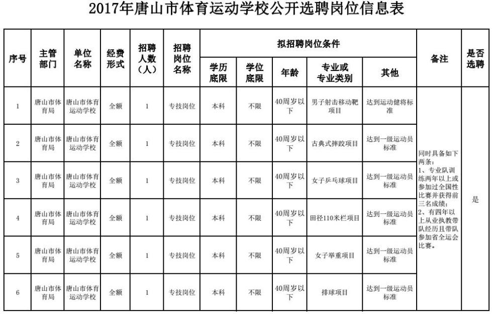 三、招聘对象和条件 应聘人员应具备以下基本条件: 1.具有中华人民共和国国籍。 2.遵守宪法和法律。 3.具有良好的品行和职业道德。 4.具有与选聘岗位要求相适应的年龄、学历学位、专业和技能条件。 5.适应岗位要求的身体条件。 6.具备岗位所需要的其他条件。 凡涉及到年龄、户籍、工作时间等需要确定时间的,计算日期截止到2017年11月5日。 四、报名方法 现场报名(初审) 11月6日-8日,上午9:00-11:00;下午2:00-5:00 ,在唐山市体育局四楼会议室报名。应聘人员须现场填写报名表,并携带本人身份证、毕业证、学位证和国家级健将证等能证明岗位条件要求的相关材料原件和复印件、4张近期2寸免冠照片。 详情登录