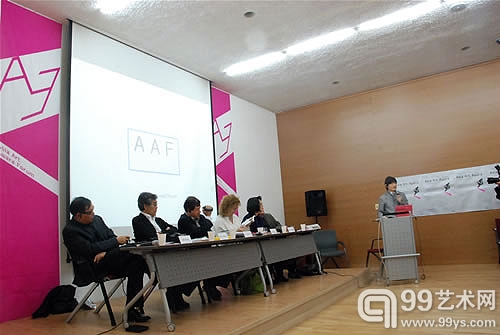 亞洲藝術獎論壇主席臺現場 2010年4月7日,亞洲藝術獎論壇(Asia Art Award Forum)媒體見面會今天在南韓首爾SOMA 美術館舉行。 來自世界各地的媒體及南韓當地的藝術愛好者也都親赴現場,與評委和藝術家們一起討論亞洲現代藝術近況,分享藝術創作和藝術經營的各种經驗。發佈會結束,評委及參與者一行參觀了“亞洲現代美術獎”預展,六位藝術家的作品大多以裝置和多媒體藝術品為主。評委與藝術家在參觀過程中深入交談,媒體及藝術從業者也相互交流,藝術家詳細為各位觀眾解釋自己的作品。 眾所週知,隨著亞洲經濟的崛起,亞洲的發展為歐美主導的不均衡的世界勾出了新的地形圖。亞洲現代藝術的快速變化,正形成著對亞細亞性的新話題,並且對21世紀藝術的方向性提出了新的要求。新形成的文化背景使我們的日常徹底地被顛覆,新藝術體系即將被重新構建。亞洲藝術獎論壇(Asia Art Award Forum)就是在這樣的背景下産生的。AAF以實驗性,多樣性,統合性為前提,意圖為新藝術構建有影響力的網路,發掘新近藝術家,同時紀錄備案,從而為21世紀現代藝術尋求對岸及對策。 著名藝術史家,芝加哥大學教授巫鴻,FUMIO Nanjo (Mori Art Museum, Director 森美術館館長),KIM Wonbang (2008 Busan Biennale, Director 2008釜山雙年展總監),Apinan Poshyananda(泰國策展人 藝術作家),Carolyn Christov-Bakargiev(義大利 策展人 作家),Jonathan WATKINS (IKON Gallery, Director聖像畫廊 畫廊總監 )六位評委出席了此次見面會。藝術家Apichatpong Weerasethakul/Thailand,Ashok Sukumaran/India,Chin Pom/Janpa,Jompet Kuswidananto/Indonesia,Shi JinSong/China(史金淞 中國),Yangachi/Korea同時出席了活動。 亞洲藝術獎論壇(Asia Art Award Forum)由 CJ 文化財團和對案空間 LOOP主辦。活動由亞洲現代美術獎預展(藝術家5名),亞洲現代美術獎頒獎儀式,現代美術論壇和對案藝術博覽會四部分構成。